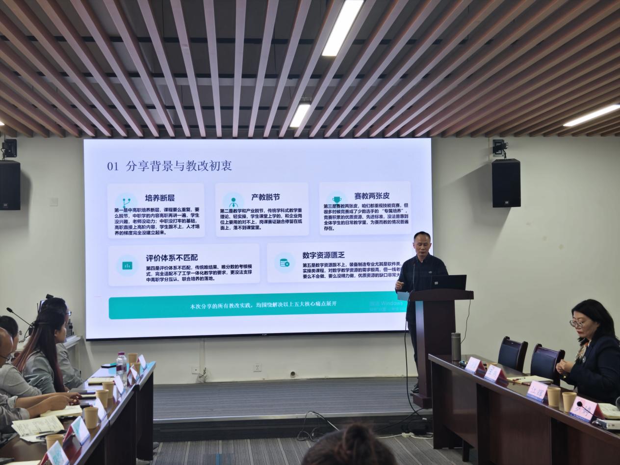 在交流环节,技能竞赛获奖教师补大琴分享了备赛、训练与竞赛组织的经验,为各校技能人才培养提供了可借鉴的实践路径;骨干教师王海宾围绕教学改革、课程建设、课堂提质等内容作专题分享,展现了装备制造专业在教学创新上的探索与成效。随后,全体参会教师围绕专业建设、课程改革、实训教学、中高职衔接等议题展开深入研讨,交流经验、碰撞思路,达成多项共识。